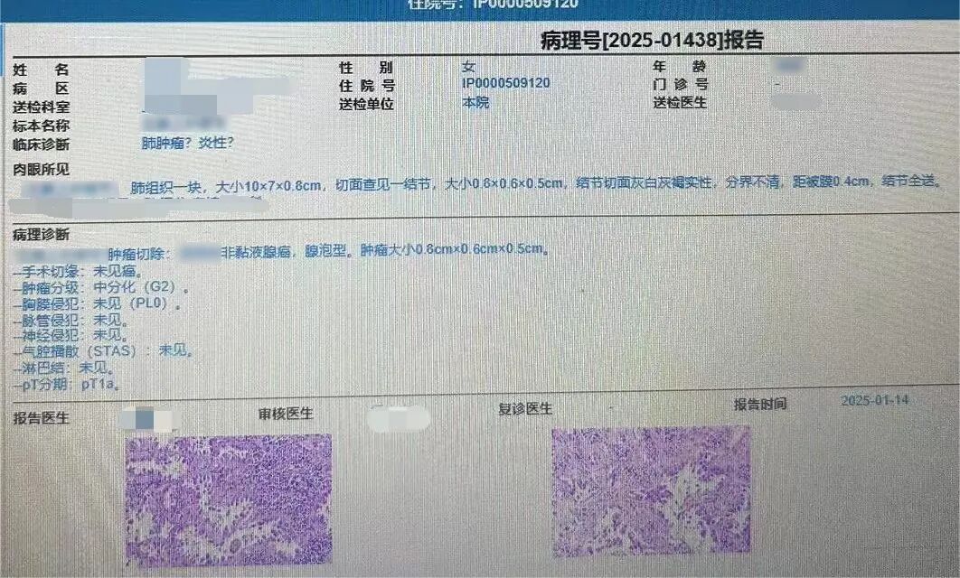 手术采用 “单孔 VATS(胸腔镜)右上肺段切除术”,术中冰冻切片病理检查显示 “微浸润性腺癌”(肿瘤大小 0.8×0.6×0.5 厘米)。手术过程顺利,患者恢复良好,病理检查确诊为肺部微浸润性腺癌[ⅠA1 期(T1miN0M0)】