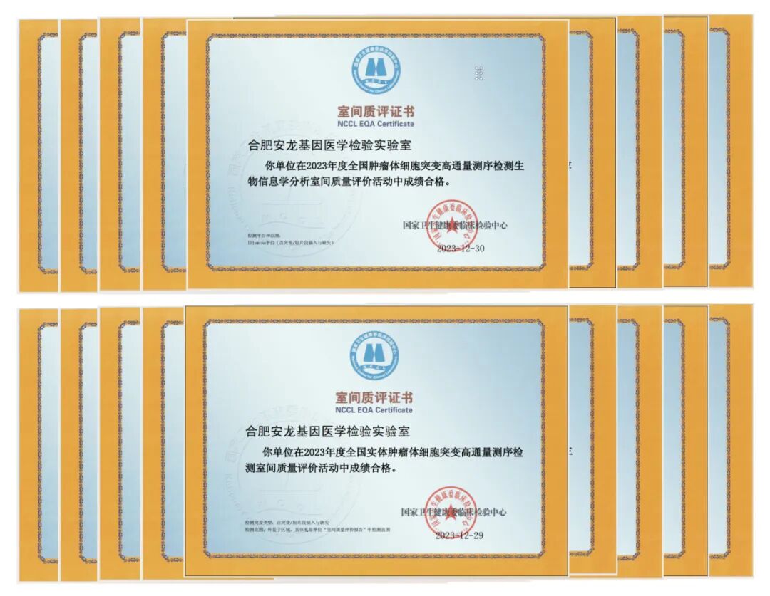 安龙基因连续7年来多次参加国家卫生健康委临床检验中心室间质评项目,全部以满分成绩通过检测,并获得相关室间质评合格证书,实验室的检测水平得到了充分肯定。