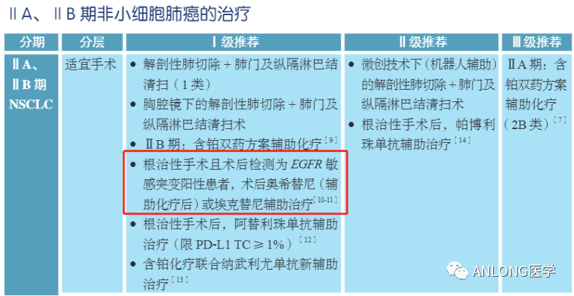 3. EGFR突变阳性的IIA、IIB期NSCLC患者,肿瘤完全切除术后推荐EGFR-TKI[奧希替尼(1A类证据),吉非替尼(1B类证据)或埃克替尼(1B类证据)]辅助治疗(一致推荐)。