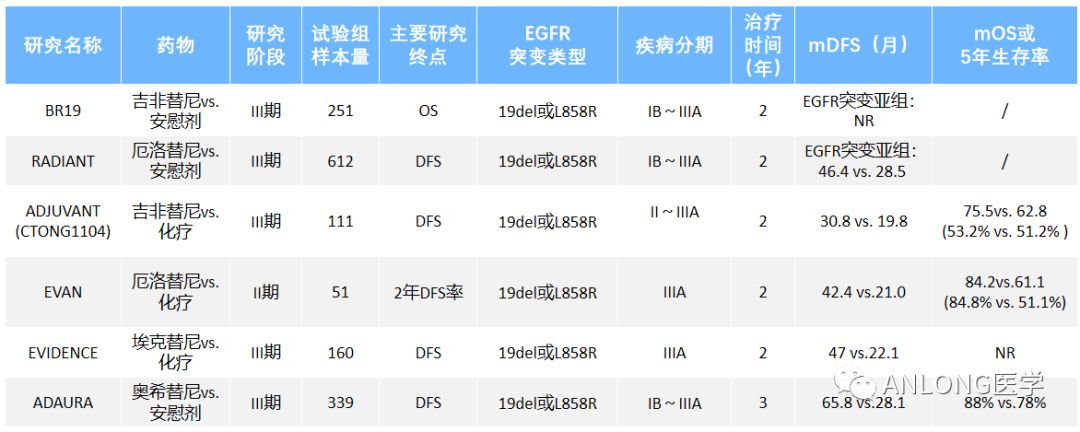 EGFR-TKI辅助治疗进行了广泛的探索。BR19以及RADIANT研究均探索了TKI在EGFR突变非选择人群中的术后辅助治疗价值,均以失败告终。另四项针对EGFR突变型NSCLC患者术后给予EGFR-TKI治疗的研究(ADJUVANT、EVAN、EVIDENCE和ADAURA研究)证实了靶向治疗作为辅助治疗的可行性。