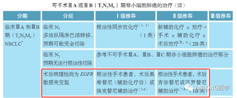 4. EGFR突变阳性的IIIA、IIIB期NSCLC患者,肿瘤完全切除术后推荐EGFR-TKI[奥希替尼(1A类证据),吉非替尼(1B类证据),埃克替尼(1B类证据)或厄洛替尼(2类证据)]辅助治疗,且优先推荐奥希替尼辅助治疗(一致推荐)。